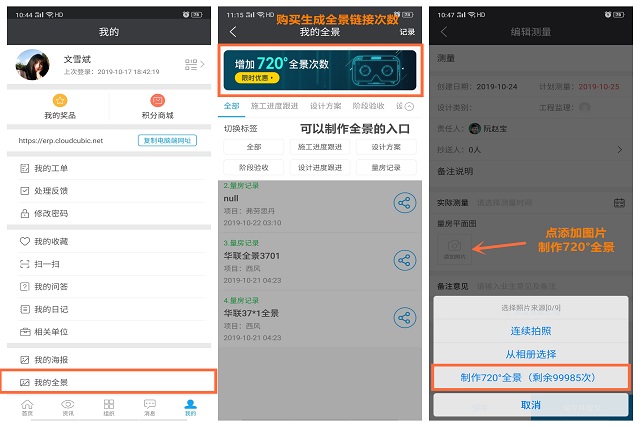 · 手上有全景圖片,可以打開云裝天下app,點“我的”-“我的全景”購買全景使用次數,再通過“施工進度跟進、設計方案、階段驗收、設計進度跟進、量房記錄”等入口,制作H5全景鏈接。