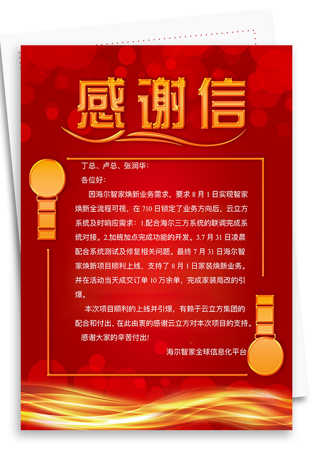 云立方收到海爾智家的感謝信后,更加堅(jiān)定走信息化賦能道路,解決裝企裝修痛點(diǎn)、打通員工、供應(yīng)商與業(yè)主之間的信息孤島,從而簡(jiǎn)化裝修流程、縮短產(chǎn)業(yè)鏈條、降低運(yùn)營(yíng)成本、提升整個(gè)裝修效率及品質(zhì)。
